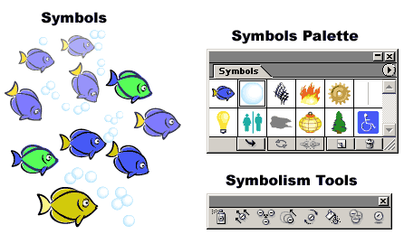 Symbols and Small File Sizes--Individuals who use such Macromedia software as Flash, Fireworks and Freehand will be familiar with the concept of symbols. Symbols are reusable and repeatable elements that can be used for almost anything. They are handy in creating navigation buttons, borders, map icons, and masses of graphics, such as foliage, snowflakes, and stars, and they can be comprised of either vector- or pixel-based images or text. The new symbols support in Illustrator 10 also helps you keep file sizes small and manage repeating elements efficiently. For instance, you can create a master graphic, save it as a symbol, and then add instances of the symbol to your design. File size is minimized because the instances reference the original symbol. This is markedly apparent when you export animations. Without symbols, each element in every frame is represented, resulting in bulky file sizes. Click on the top fish image to the left to view a Flash animation made with symbols in Illustrator. Automatic Updating--Another advantage is that when you edit or redefine a symbol, the instances update automatically. Yet, the transformations applied to the symbol instances, such as screening, tinting, resizing, and rotating, are maintained when the symbol is redefined. Symbol Libraries--The program also supports symbol libraries, so you can share symbols across multiple documents. Symbolism Tools-- Besides helping keep file size small, in Illustrator 10, symbols have become an invaluable design tool. You can create masses of natural-looking objects by simply defining a symbol, and then use the new Symbol Sprayer tool to add instances to your drawing. Then with other Symbolism tools, you can manipulate the instances and make each one look unique. There is also a Symbolism Tool Options dialog box to change the tool settings. See the two lower images to the left for a view of symbols, Symbolism Tools, and the dialog box. For the fish and bubble image to the left, I used the Symbol Sprayer to apply multiple instances of the symbols, and then used the other Symbolism tools to resize, spin, adjust opacity, and tint the fish and bubbles. There is a Break Link To Symbol option on the Symbols palette so that you can create a fully editable element, which I used for the two green fish in the image. The Symbol Sprayer is a great tool, fun to use, and a time-saver. No more tedious copying and pasting objects to create masses of similar objects. The Symbolism tools are:
