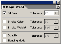 | The new magic wand tool allows you to select a range of objects with similar attributes. For example, you can select objects using a particular blend mode, or with a stroke weight between 1 and 3 points. A new Select menu, just like the one in Adobe Photoshop, lets you save and load selections, select objects hidden behind other elements, and more. See image to the left for a view of the Magic Wand options. | |