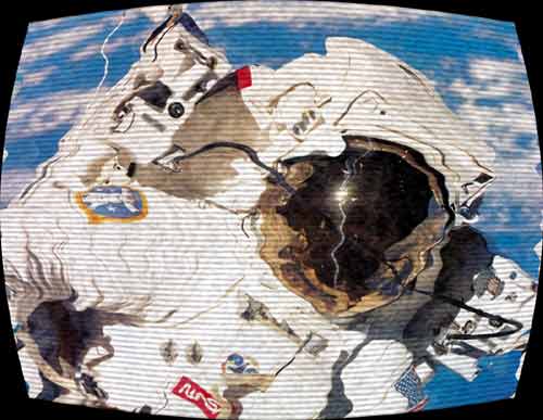 | Shatter explodes images into three-dimensional shards that fly off the page. It is great for GIF animations. You can set the size, lighting, thickness and shadows of the pieces of the shattered image, the degree of tumble, and the point in time of the process of the shatter--early for the stage when the cracks are just starting to appear and late for when the pieces have already scattered and few remain within the visible portion of the canvas. See image to the left for a view of using Shatter on just the background layer of the graphic to create an interesting effect. | |