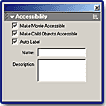 | The Accessibility panel enables you to create descriptions of movie elements for use with screen-reader technology to make Web sites more useful for people with vision impairments. See image to the left for a view of the Accessibility panel and the various options you have. To add descriptive text to your animations and user interface elements, you simply select the item you wish to tag, enter the appropriate text description, and when users with assistive technologies (Screen Readers, brail output, etc.) encounter your content they will be able to navigate and take part in your content in the same manner as an HTML document authored with accessibility in mind. | |