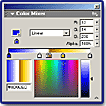 | Color Mixer enhancements make creating, editing, and using colors and gradients easier than ever. In Flash MX, the Fill panel is no longer needed to select a color style. The new color style menu available on the Color Mixer panel allows you to choose the type of color pattern that you want to work with--including solid colors, linear and radial gradients, and bitmap fills. The upper part of the Color Mixer panel is much the same as what you had in the old mixer. All of the Fill Type information is included here as well. In the bottom part of the panel are much improved color-manipulation tools. It includes a new Hue/Saturation picker, Brightness slider, before/after color indicator, and integrated HEX value display. And there is integrated color gradient editing which means gradients can be mixed and applied without using secondary panels. See image to the left for a view of the Color Mixer. | |