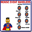 | Advanced Beginners, intermediate, and advanced computer users. You should have a good working knowledge of your computer and Web design before you tackle this program. As, it is a sophisticated program, it does take a fair amount of dedication to learn the robust features. Help is readily available, though, from within the program, books, and on the Web. See book cover images below for examples of some available Flash MX books that are referenced in this review. The image to the left shows a swf file explaining mouse event handlers. You need to perform the appropriate action on each button to make the figure move. It is from: Flash MX Savvy by Ethan Watrall and Norbert Herber, from Sybex. | |