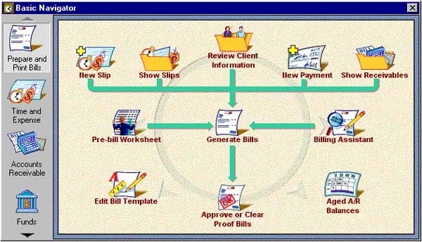 This graphically-rich navigator was specifically designed as a simple, yet descriptive Navigator, which uses icons and text written to guide you easily through Timeslips. |