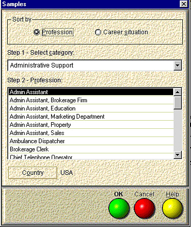 resumes and (2) AutoWriter, with its job specific phrases and keywords. Samples are divided by profession or career situation, then by category. You can select a sample resume and then add additional specific phrases with AutoWriter, if needed. For those users who want more hands on creating, you can start with a